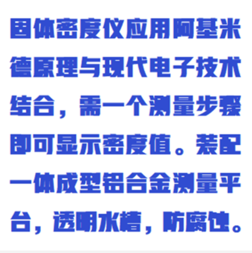 固體密度儀應(yīng)用阿基米德原理與現(xiàn)|代|電子技術(shù)結(jié)合,需一個測量步驟即可顯示密度值。裝配一體成型鋁合金測量平臺,透明水槽,防腐蝕。