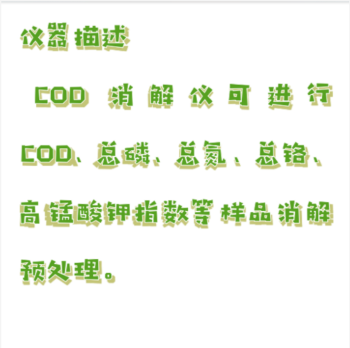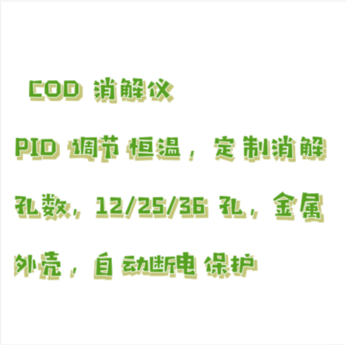 COD 消解儀可進行 COD、總磷、總氮、總鉻指數等樣品消解預處理。該儀器可以自動完成恒溫計*時時間,時間設定 1~999 分鐘,溫度恒定時間到達后儀器具有自動聲報警功能,無需人工參與。溫度漂移小,恒溫精度高。儀器采用 PID 控制,具有升溫速度較K,溫度緩沖小、溫度恒定均勻等特點,操作簡便,是一種實驗手段儀器化產品。