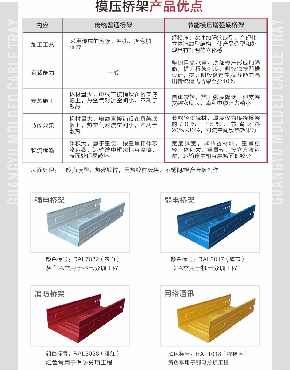 模壓橋架是一種采用模壓工藝制造的電纜橋架,具有強度高、美觀、耐腐蝕等諸多優勢,在電氣安裝工程中應用廣泛。以下是關于它的詳細介紹: