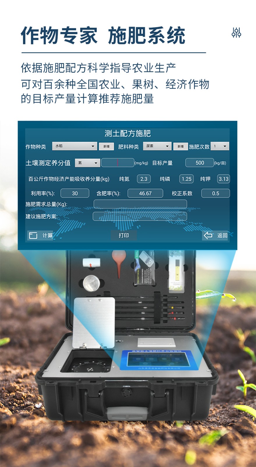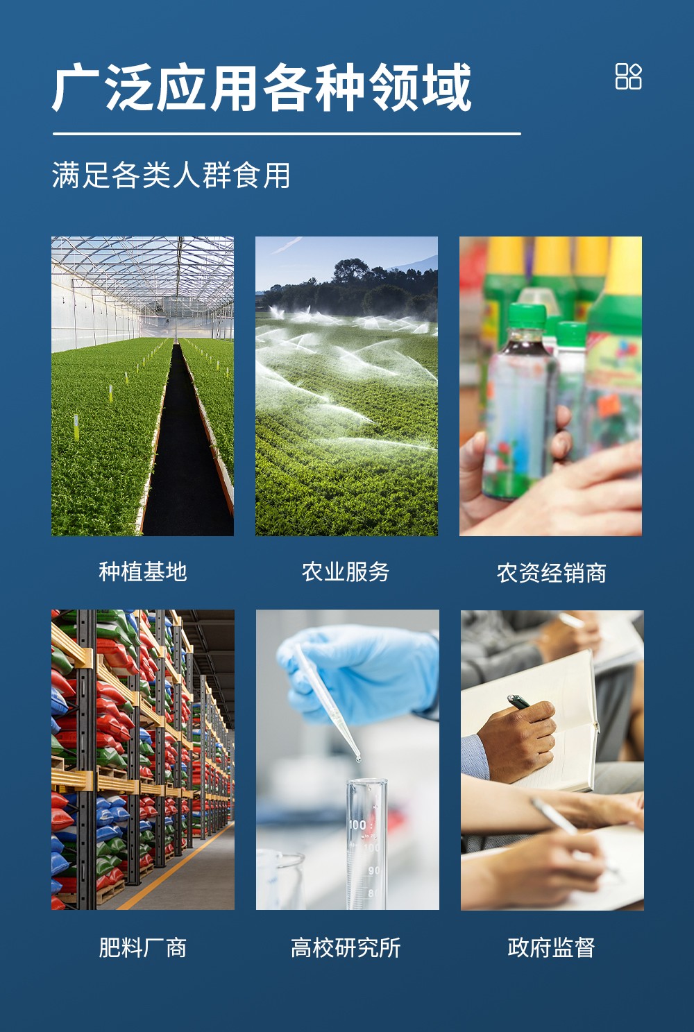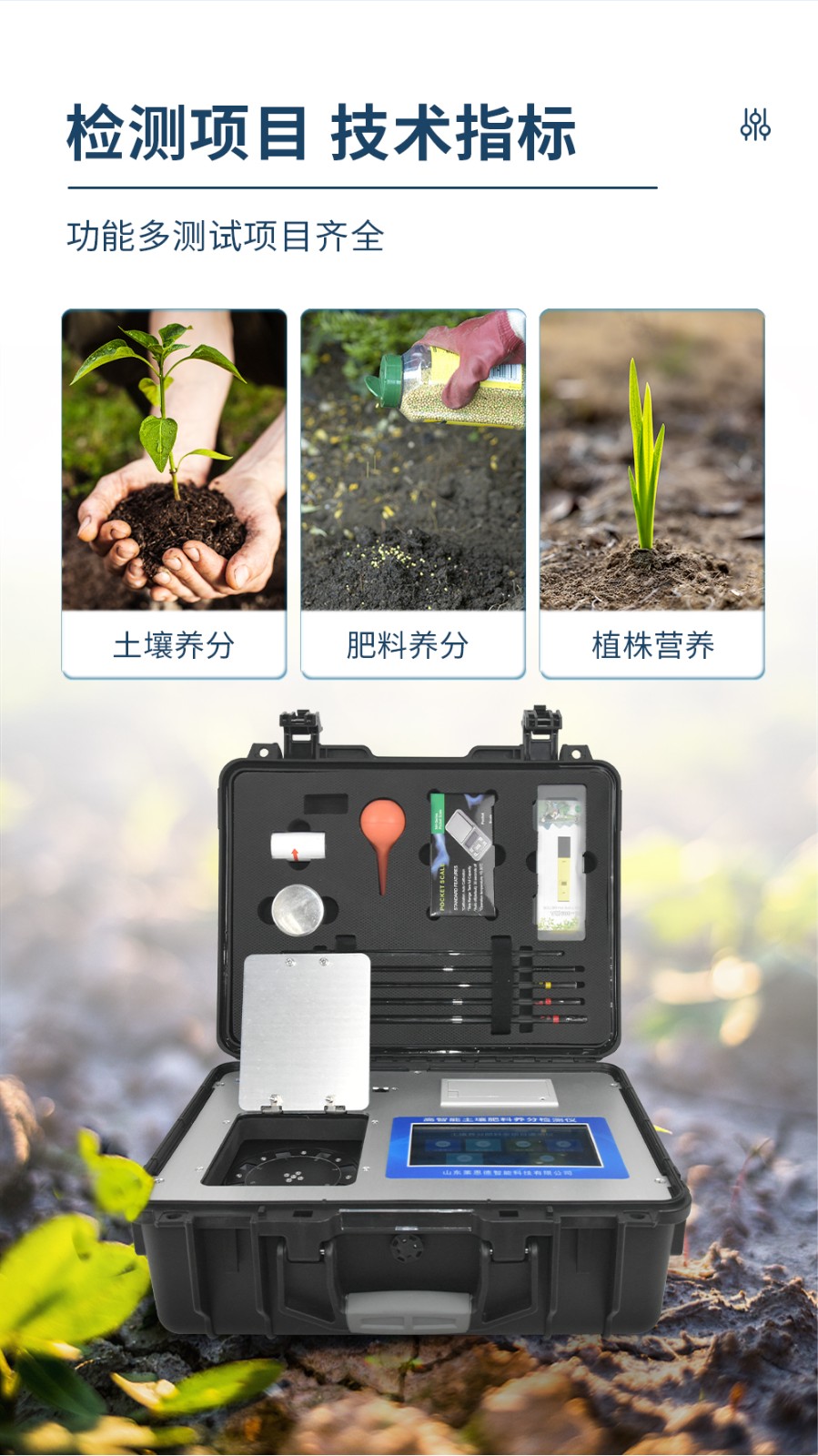 配套齊全:該儀器集藥、器、儀為一體,攜帶方便,相當于一個小型移動實驗室,無需用戶自配附件,亦可靈活野外流動測試。適于農業服務部門或農資經銷商、合作社、肥料廠商、大種植戶測土施肥和鑒別肥料真假。