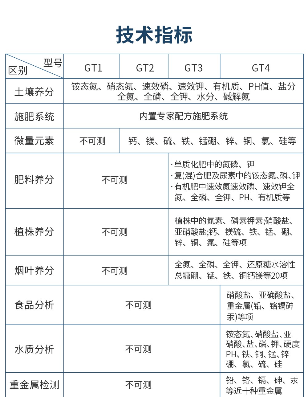 3、鮮作物營養:作物硝態氮、作物銨態氮、作物磷、作物鉀;作物中微量元素:作物鈣、作物鎂、作物硫、作物硅、作物硼、作物鐵、作物銅、作物錳、作物鋅、作物氯、作物鉬;作物中硝酸鹽、亞硝酸鹽。